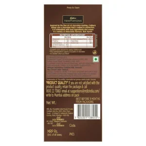 Cadbury Temptations brings you delicious premium chocolate in Rum & Raisins flavour. It is inspired by the fine art of chocolate making, which brings you chocolate that’s crafted to perfection. Created with the best ingredients, this milk chocolate bar comes in a variety of delectable flavours like Rum & Raisin and Almond Treat. This chocolate…