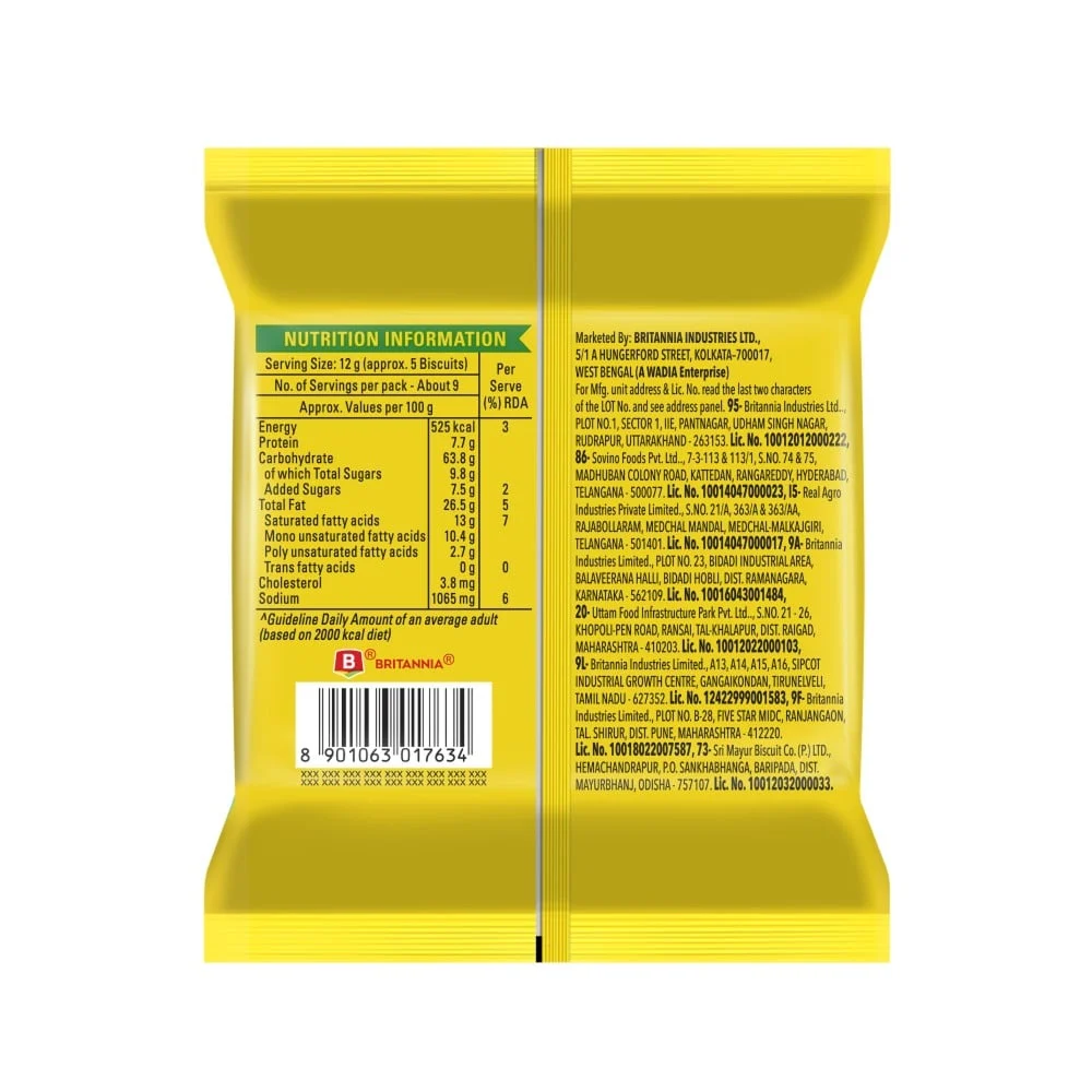 Ingredients: Ingredients: Refined Wheat Flour (Maida), Refined Palm & Palmolein Oil, Sugar, Liquid Glucose, Raising Agents [503(Ii), 341(Ii), 500(Ii) & 450(I)], Butter (1.2%), Black Salt, Milk Solids, Dehydrated Vegetable (Chives) (1%), Iodised Salt, Nature Identical Flavouring Substance And Dough Conditioner (223).