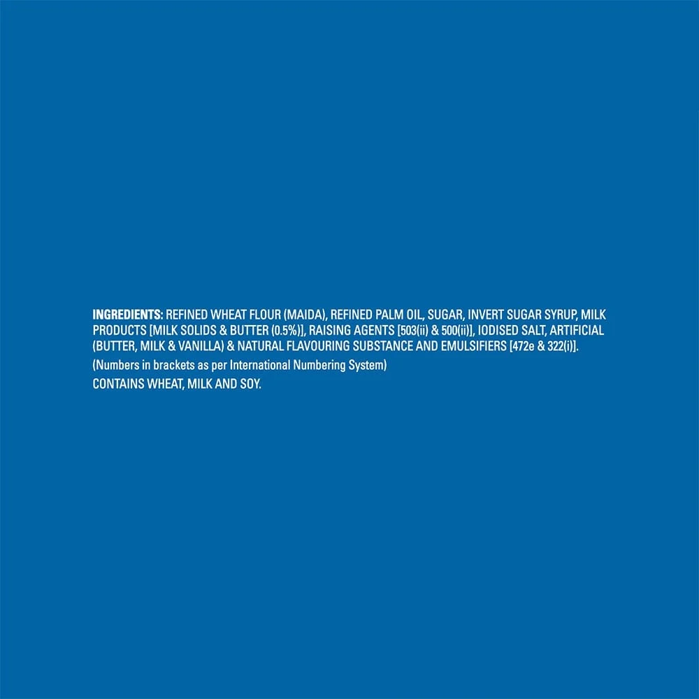 Ingredients:Â Refined Wheat Flour (Maida), Refined Palm Oil, Sugar, Invert Sugar Syrup, Milk Products [Milk Solids & Butter (0.5%)], Raising Agents (503) & 500], Iodised Salt, Artificial (Butter, Milk & Vanilla) & Natural Flavouring Substance And Emulsifiers (472E & 322(0)]. (Numbers In Brackets As Per International Numbering System) Contains Wheat, Milk And Soy.