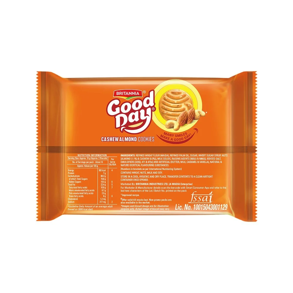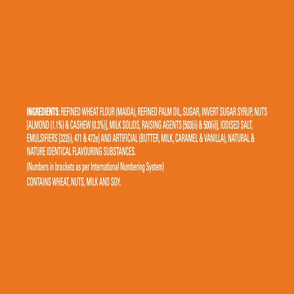Ingredients: Refined Wheat Flour, Sugar, Edible Vegetable Oil, Butter (4.2%), Cashew Bits (4%), Milk Solids, Raising Agent [E500(Ii), E503(Ii)], Salt, Emulsifier (E322(I), E471), Artificial Flavouring Substances (Nuts, Butter, Vanilla)
