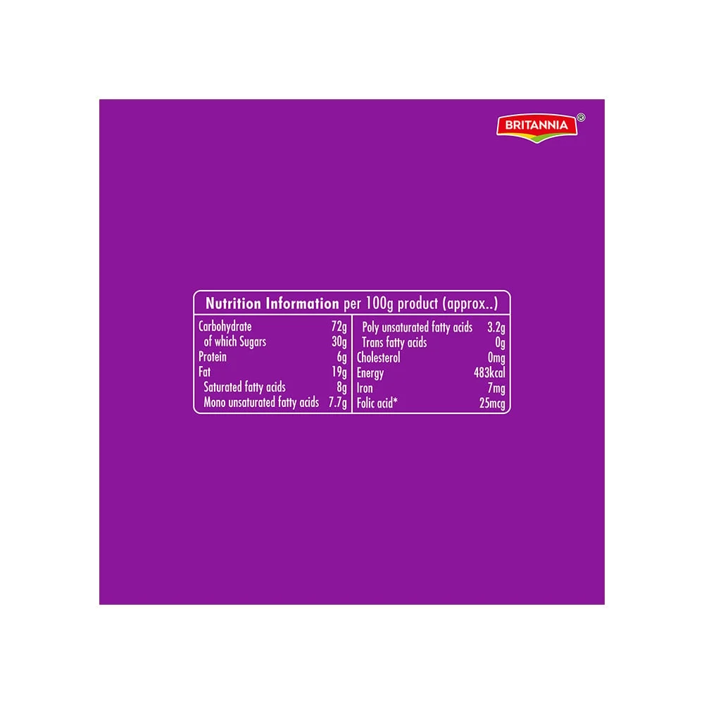 Protein Per 100 g (g)6gEnergy Per 100 g (kcal)483KcalTotal Fat Per 100 g (g)19gTrans Fat Per 100 g (g)0gSaturated Fat Per 100 g (g)8gUnsaturated Fat Per 100 g (g)10.9gMonosaturated Fat Per 100 g (g)7.7gTotal Carbohydrates Per 100 g (g)72gPolysaturated Fat Per 100 g (g)3.2gCholesterol Per 100 g (g)0gTotal Sugar Per 100 g (g)30g