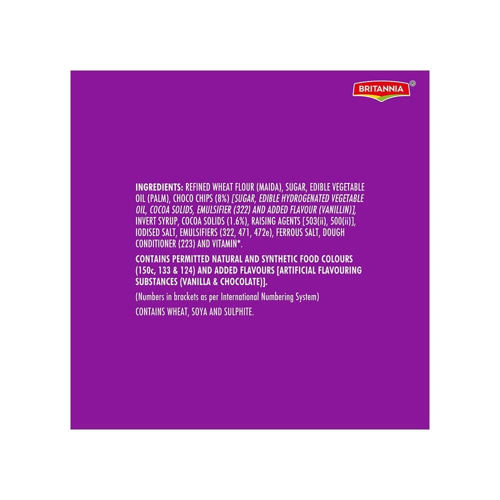 Ingredients: Refined Wheat Flour (Maida), Sugar, Edible Vegetable Oil (Palm), Choco Chips (8%) [Sugar, Edible Hydrogenated Vegetable Oil, Cocoa Solids, Emulsifier (322) And Added Flavour (Vanillin)], Invert Syrup, Cocoa Solids (1.6%), Raising Agents [503(Ii), 500(Ii)], Iodised Salt, Emulsifiers (322, 471, 472E), Ferrous Salt, Dough Conditioner (223) And Vitamin*. Contains Permitted Natural And Synthetic Food Colours (150C, 133 & 124) And Added Flavours [Artificial Flavouring Substances (Vanilla & Chocolate)]. (Numbers In Brackets As Per International Numbering System) Contains Wheat, Soya And Sulphite.