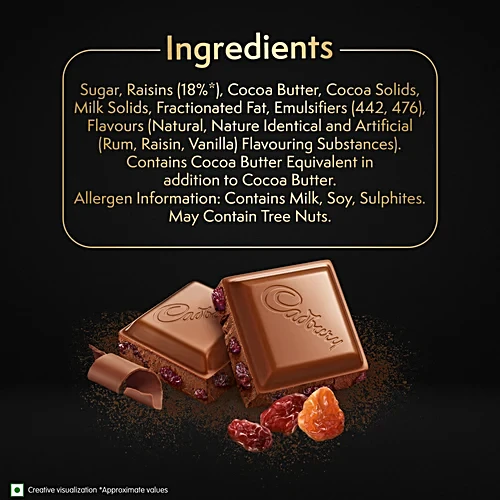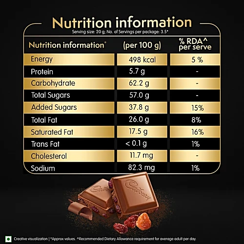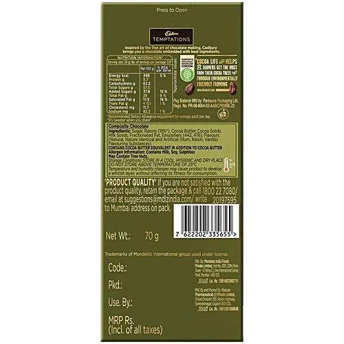 Cadbury Temptations brings you delicious premium chocolate in Rum & Raisins flavour. It is inspired by the fine art of chocolate making, which brings you chocolate that’s crafted to perfection. Created with the best ingredients, this milk chocolate bar comes in a variety of delectable flavours like Rum & Raisin and Almond Treat. This chocolate bar pack is a perfect gift for special occasions like birthdays and get-togethers. Just like every bar of Cadbury Dairy Milk, this chocolate bar is made from sustainably sourced cocoa.