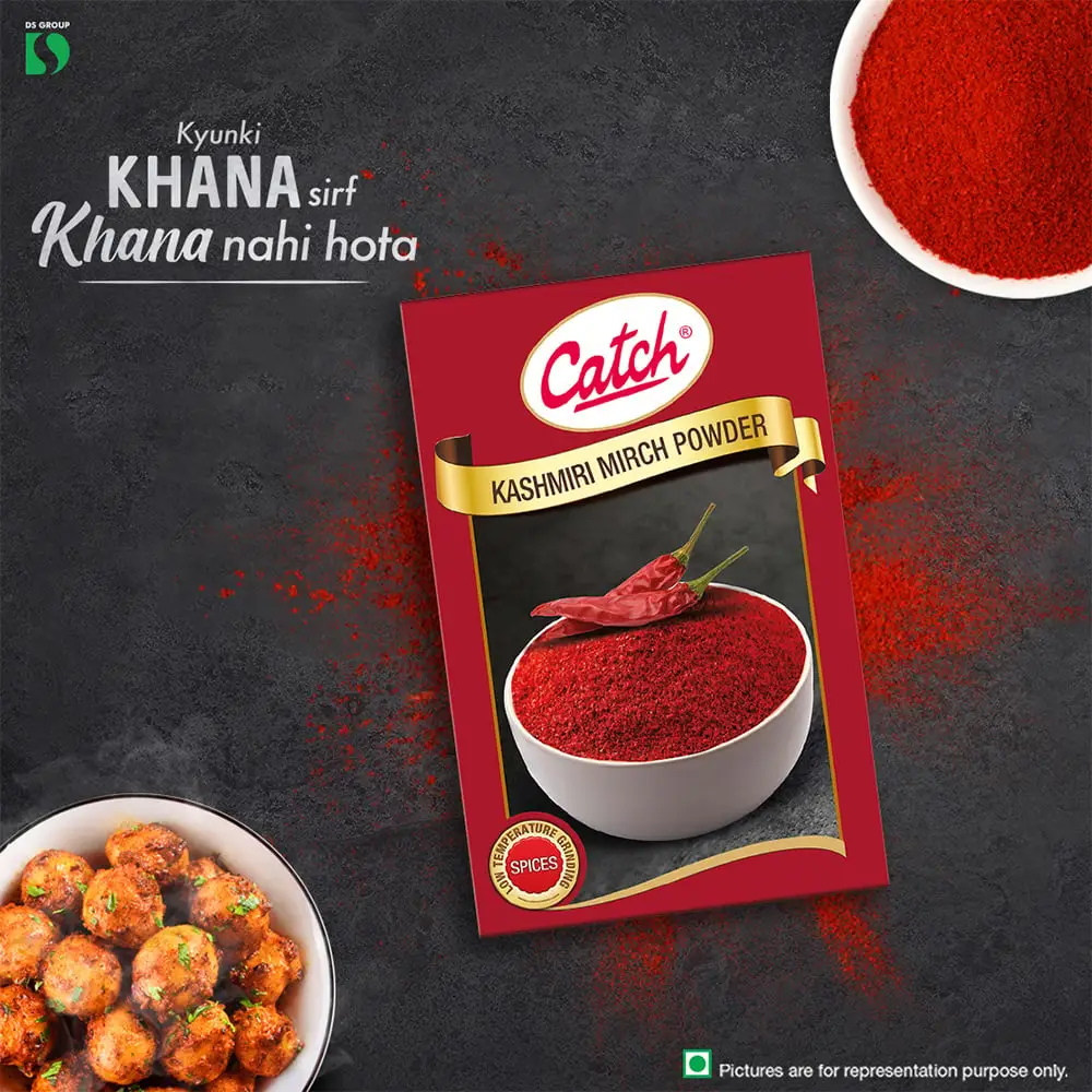 Catch Kashmiri Mirch Powder adds vibrant red color to dishes without excessive heat. Made from premium stem-less chillies sourced from prime regions like Byadgi, Karnataka, it offers high color value and authentic quality. Processed with Low Temperature Grinding Technology to retain natural oils and flavors, it is hygienically packed with minimal human contact for freshness and purity.