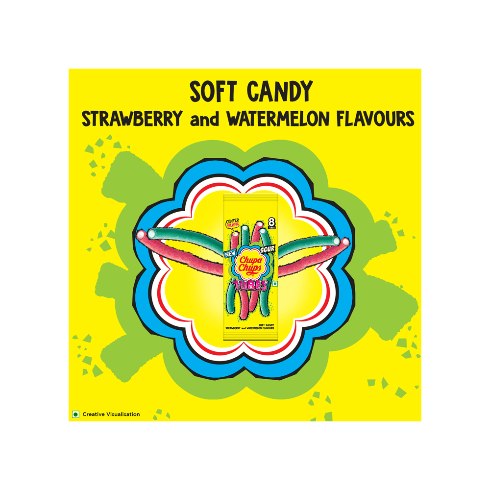 Description: Chupa Chups has conquered the taste, the mind and the heart of millions of consumers worldwide. Its personality and eye catching colours inspires a Forever Fun style. Chupa Chups keeps your childish spark alive forever- You know what they say, fun is for life, not just for kids. Now share some joyful moments with these cheeky and spontaneous soft chewy candy in starwberry and watermelon flavours.