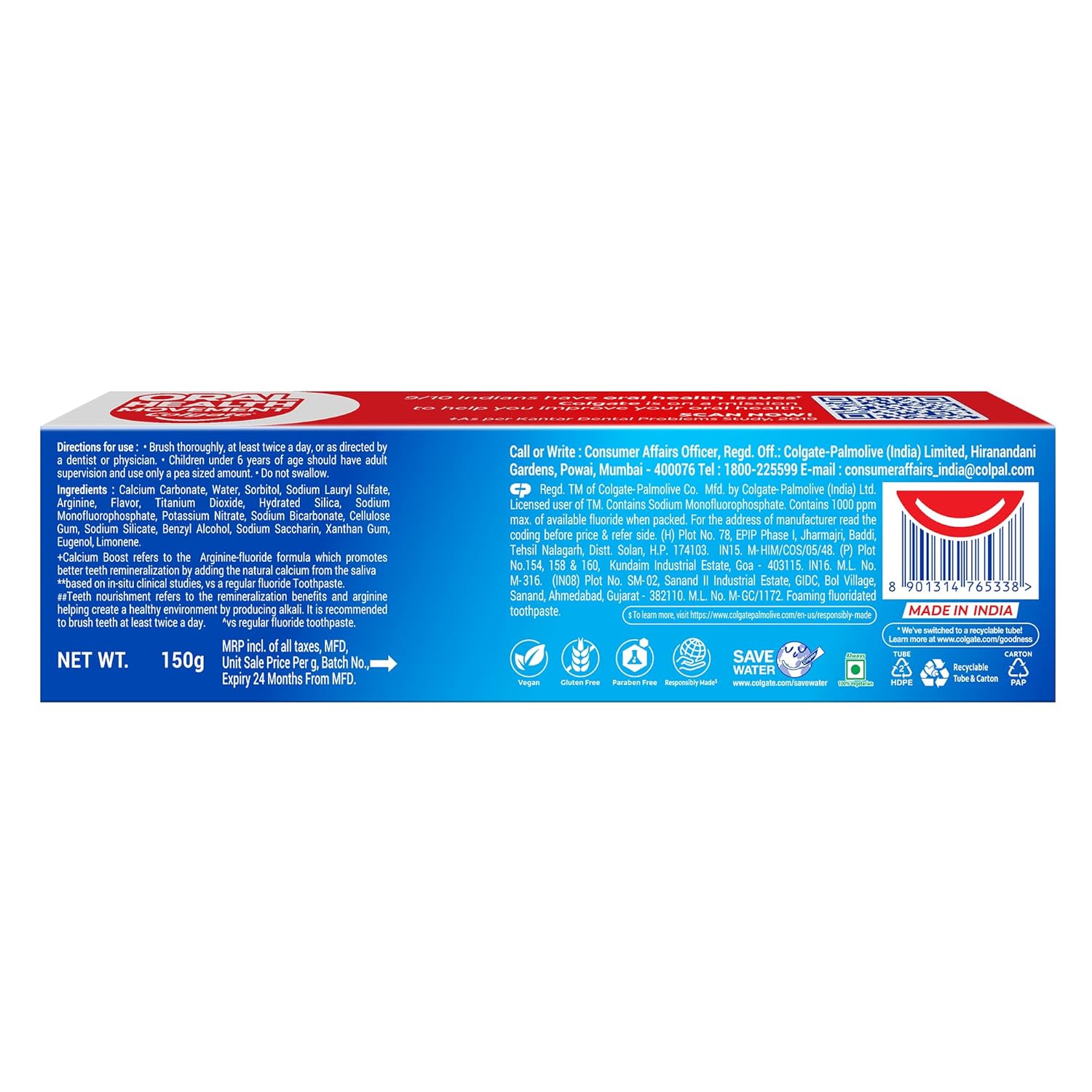 It helps add natural calcium to your teeth giving them 2x strengthening power (v/s other ordinary fluoride toothpaste) Accepted by Indian Dental Association as an effective anticavity toothpaste. This toothpaste is also 100% vegan and gluten free. This is a quality product made in India. Good oral care habits keep your teeth and gums healthy, prevents tooth decay, gum disease & bad breath. To maintain good oral hygiene brush twice a day for 2 minutes each time, rinse with mouthwash for 30 seconds, and replace your toothbrush every 3 months Take a pea-sized amount of paste on your brush. Brush thoroughly for 2 minutes, using short, gentle back and forth strokes. Children below 6 years of age should have adult supervision. This toothpaste is 100% Vegan, Gluten-Free and is made responsibly.