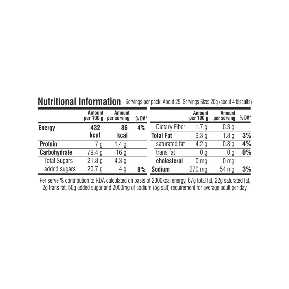 Protein Per 100 g (g)7 gEnergy Per 100 g (kcal)432 kcalTotal Fat Per 100 g (g)9.3 gTrans Fat Per 100 g (g)0 gSaturated Fat Per 100 g (g)4.2 gSodium Per 100 g (mg)270 mgTotal Carbohydrates Per 100 g (g)79.4 gAdded Sugars Per 100 g20.7 gDietary Fiber Per 100 g (g)1.7 gCholesterol Per 100 g (g)0 gTotal Sugar Per 100 g (g)21.8 g