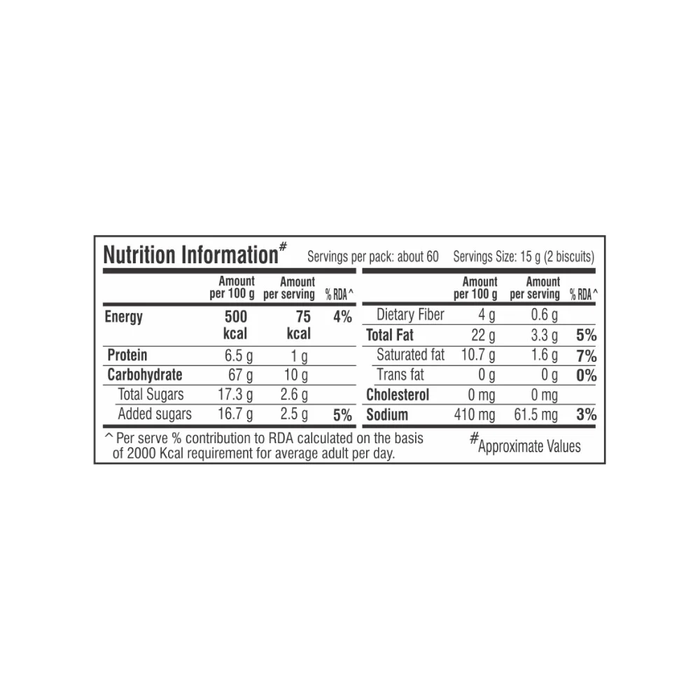 Protein Per 100 g (g)6.5 gEnergy Per 100 g (kcal)500 kcalTotal Fat Per 100 g (g)22 gTrans Fat Per 100 g (g)0 gSaturated Fat Per 100 g (g)10.7 gSodium Per 100 g (mg)410 mgTotal Carbohydrates Per 100 g (g)67 gAdded Sugars Per 100 g2.5 gDietary Fiber Per 100 g (g)4 gCholesterol Per 100 g (g)0 gTotal Sugar Per 100 g (g)17.3 g