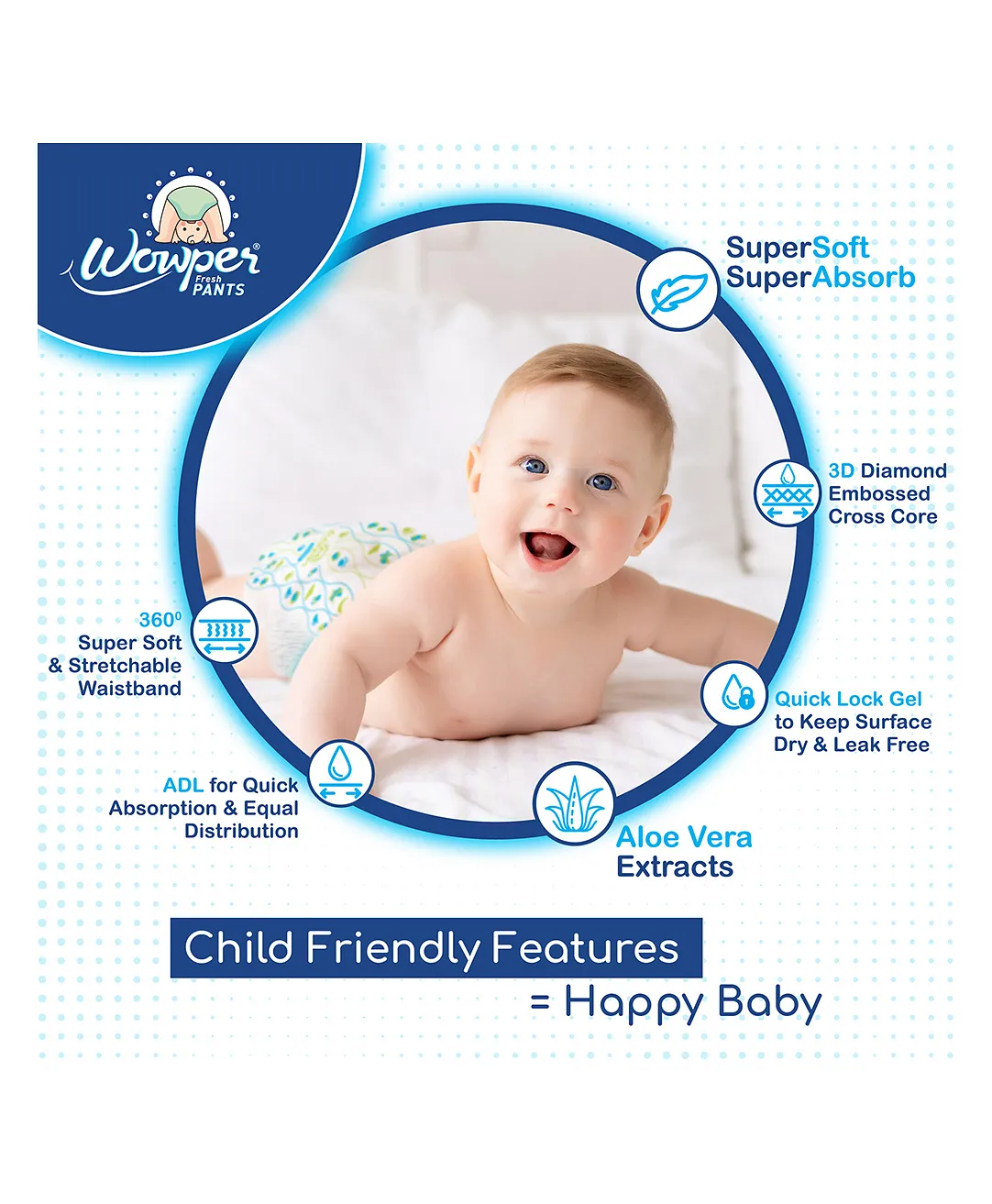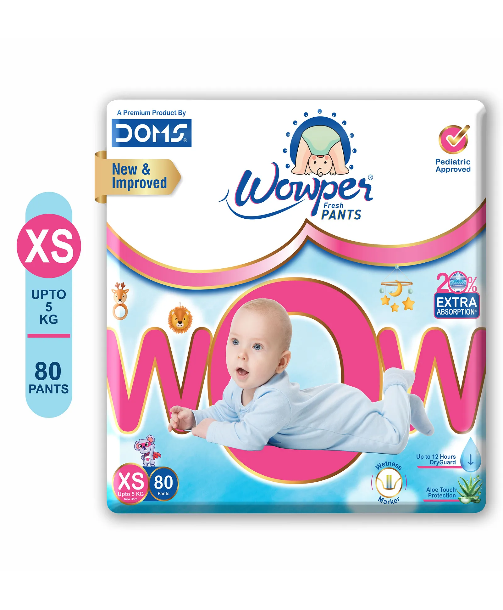 Wowper Fresh Pants Style Diapers are the only pant style diaper in India with new air flow material providing your baby a fresh night. It has 360 degree super soft and super absorb and stretchable waist band. It prevents leakage whole night till morning. Wowper Fresh Pants are available in Small(S), Medium(M), Large(L), and Extra Large (XL) sizes. These pants are easy to wear and handle.