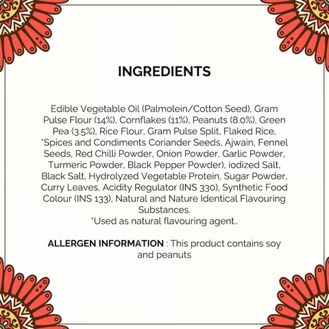 Ingredients: Edible Vegetable Oil(Palm olein /Cotton Seed ),Gram Pulse Flour,(14%),Cornflakes(11%),Peanuts(8%) Green Pea(3.5%) Rice Flour, Gram Pulse Split, Flaked Rise,*Spices & Condiments Coriander Seed, Ajwain, Fennel Seed, Red Chilli Powder, Onion Powder, Garlic Powder, Turmeric Powder, Black Pepper Powder) Iodized Salt, Black Salt, Hydrolyzed Vegetable Protein, Sugar Powder, Curry Leaves, Acidity Regulator (INS 330),Synthetic Food Color (INS 133). Natural And Nature Identical Flavoring Substances.