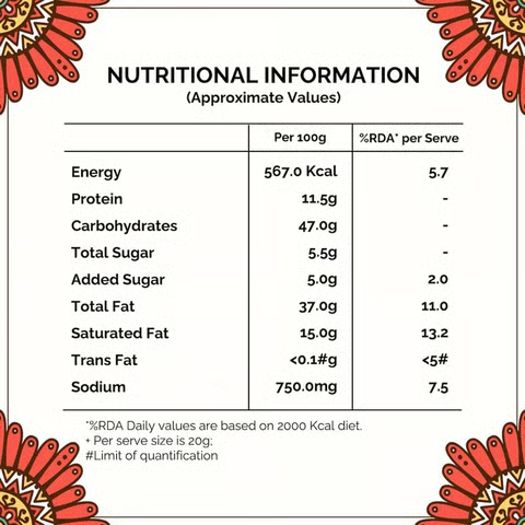 - Nutrition Information: Energy 586.0 kcal -Protein 17.0 g -Total Carbohydrate35.7g -Total Sugar 2.9 g – Added Sugar 0.0 g, Total Fat 41.7g, Saturator Fat 16.7 g, Trans Fat 0.1g, – Sodium650.0mg