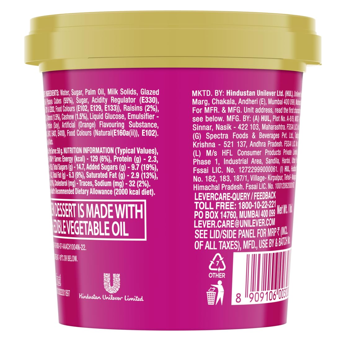 Water, Sugar, Palm Oil, Milk Solids, Fruit Pieces (5%), Papaya Cubes (55%), Sugar, Acidity Regular ( E330), Preservatives – E211 & E202, Food Colours, Raisins (2%), Blackcurrent (2%), Almond (1.5%), Cashew (1.5%), Liquid Glucose, Vegetable Protein (Soy), Artificial Flavour Substance, Stabilizers, Food Colours, Contains Milk, Soy & Nuts.