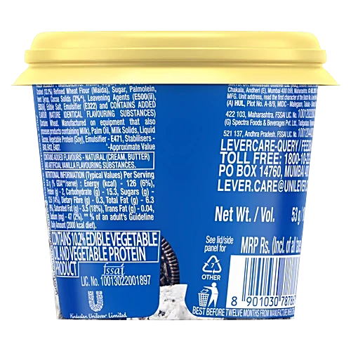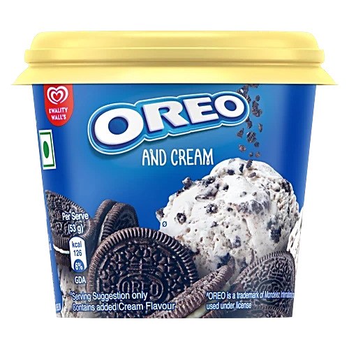 Treat yourself to Kwality Wall’s Oreo & Cream Frozen Dessert, a velvety symphony of rich chocolatey Oreo goodness blended with creamy waves of decadence. Each spoonful unveils a delightful fusion of crunchy cookie crumbles and luscious vanilla swirls, delivering a satisfyingly smooth and indulgent experience. Perfect for those who crave a harmonious balance of textures and flavours in every bite.