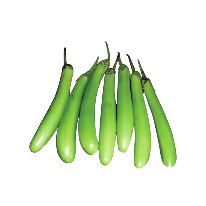 Longer, slender than green Brjinjal. The skin as well as seeds are edible, crispy and fibrous. Popularly served roasted or fried with spices.