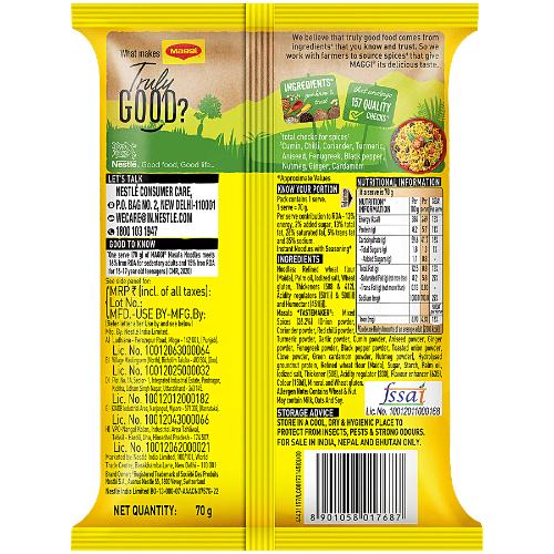 MAGGI 2-Minute Instant Masala Noodles is loved by all ages and now comes with the goodness of iron, providing 15% of daily requirement per 75g serve. Made with choicest spices and quality ingredients, it’s a quick and tasty meal anytime. Enjoy MAGGI noodles—steamed, dried, or fried—along with vegetables, fruits, and milk for a balanced diet.