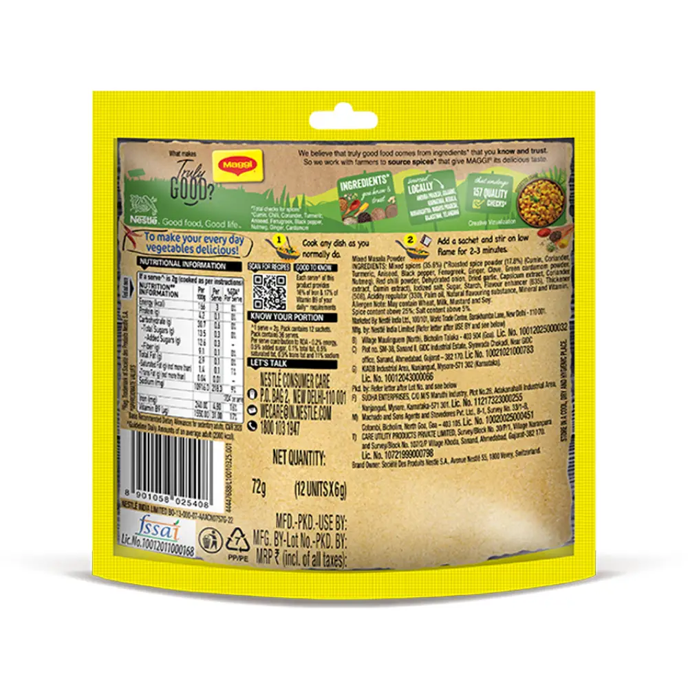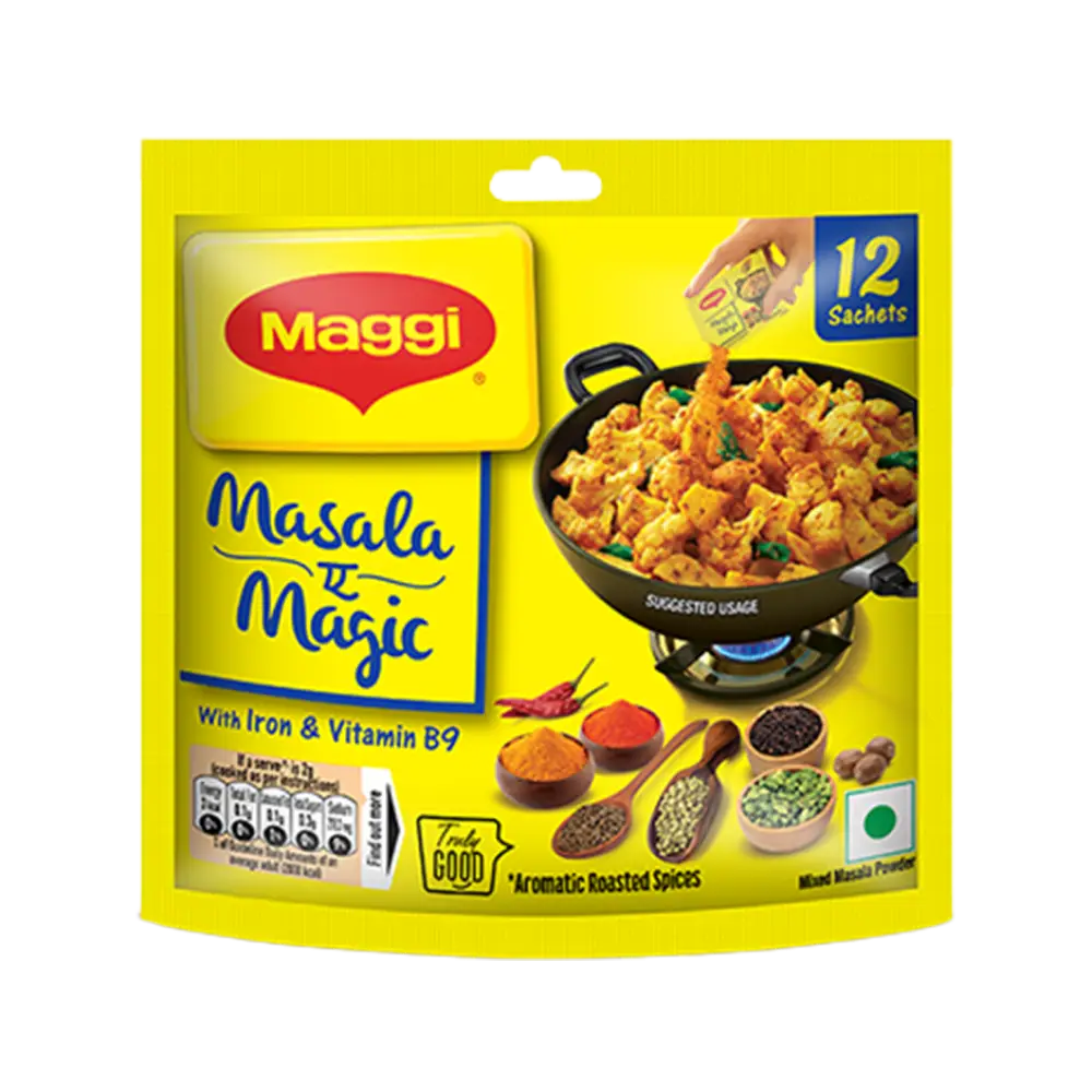 Maggi Masala-ae-Magic is a perfect blend of 10 choicest, aromatic & roasted spices. This masala is the secret ingredient that makes everyday vegetables tasty. Now your kids will fall in love with everyday vegetables. Use Maggi Masala in a variety of dishes like Sabzi, Dal, Paneer, Snacks & more. Each serve (2g) provides 16% of Iron, and 17% of Vitamin B9 of your daily requirement.