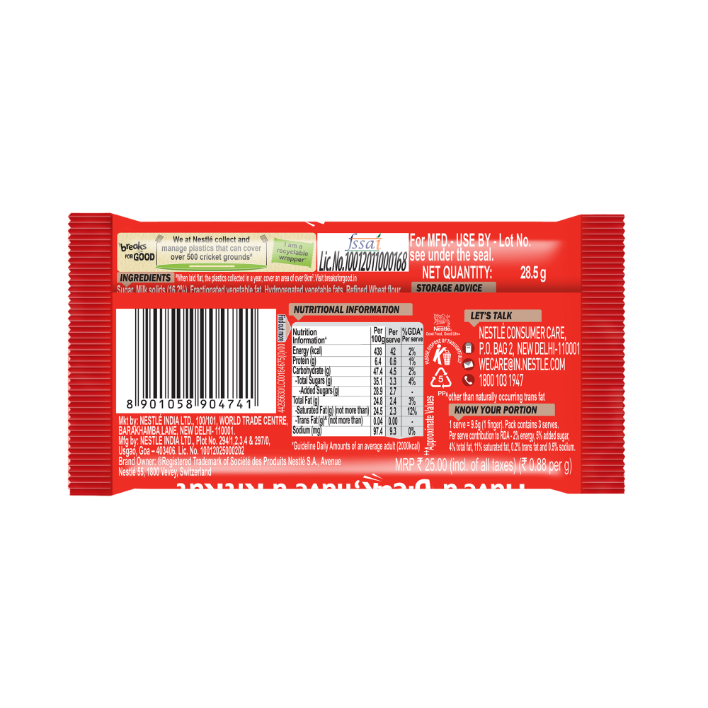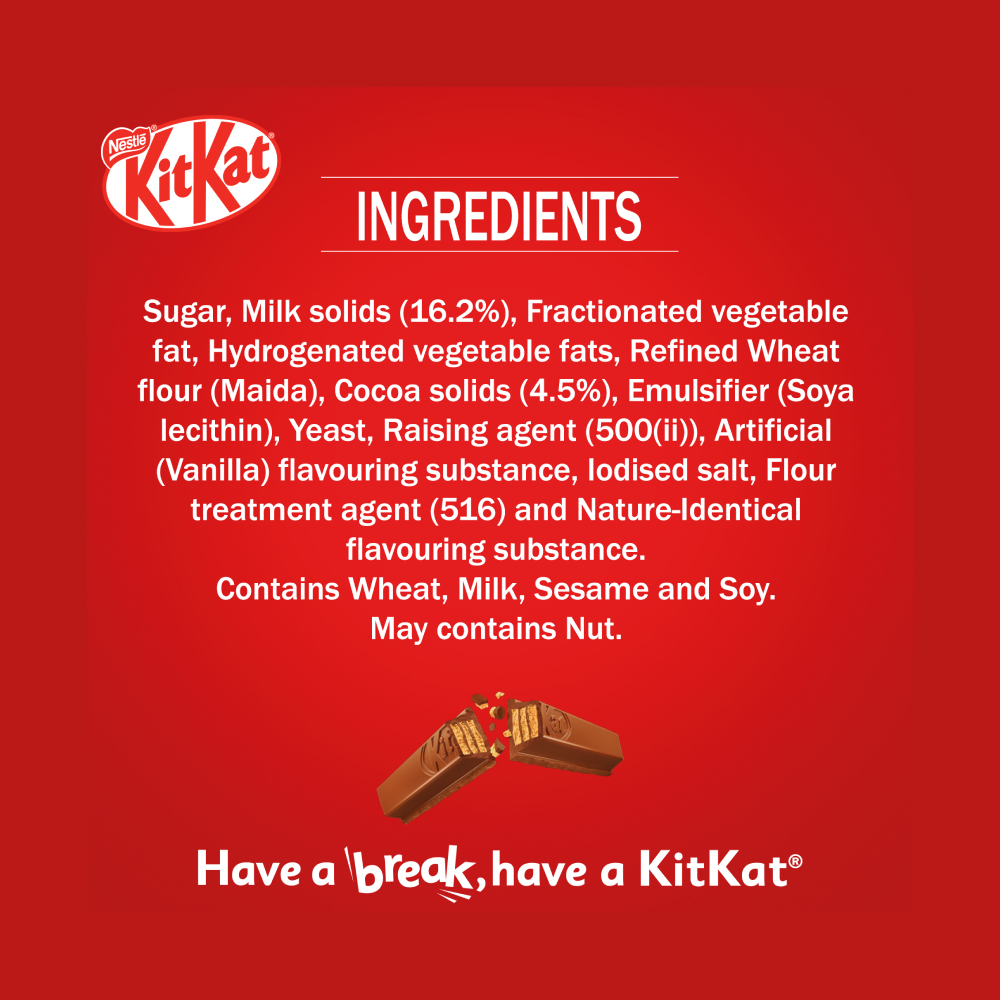 Description: NESTLE KITKAT is the ideal partner for your breaks. The iconic KITKAT taste and texture with the crispiness of the wafer bar will delight your senses and make your breaks delicious. Indulge in this delicious crispy treat alone or share it with your loved ones. Just unwrap your KITKAT, break off one of the fingers, snap into two and enjoy! HAVE A BREAK, HAVE A KITKAT.