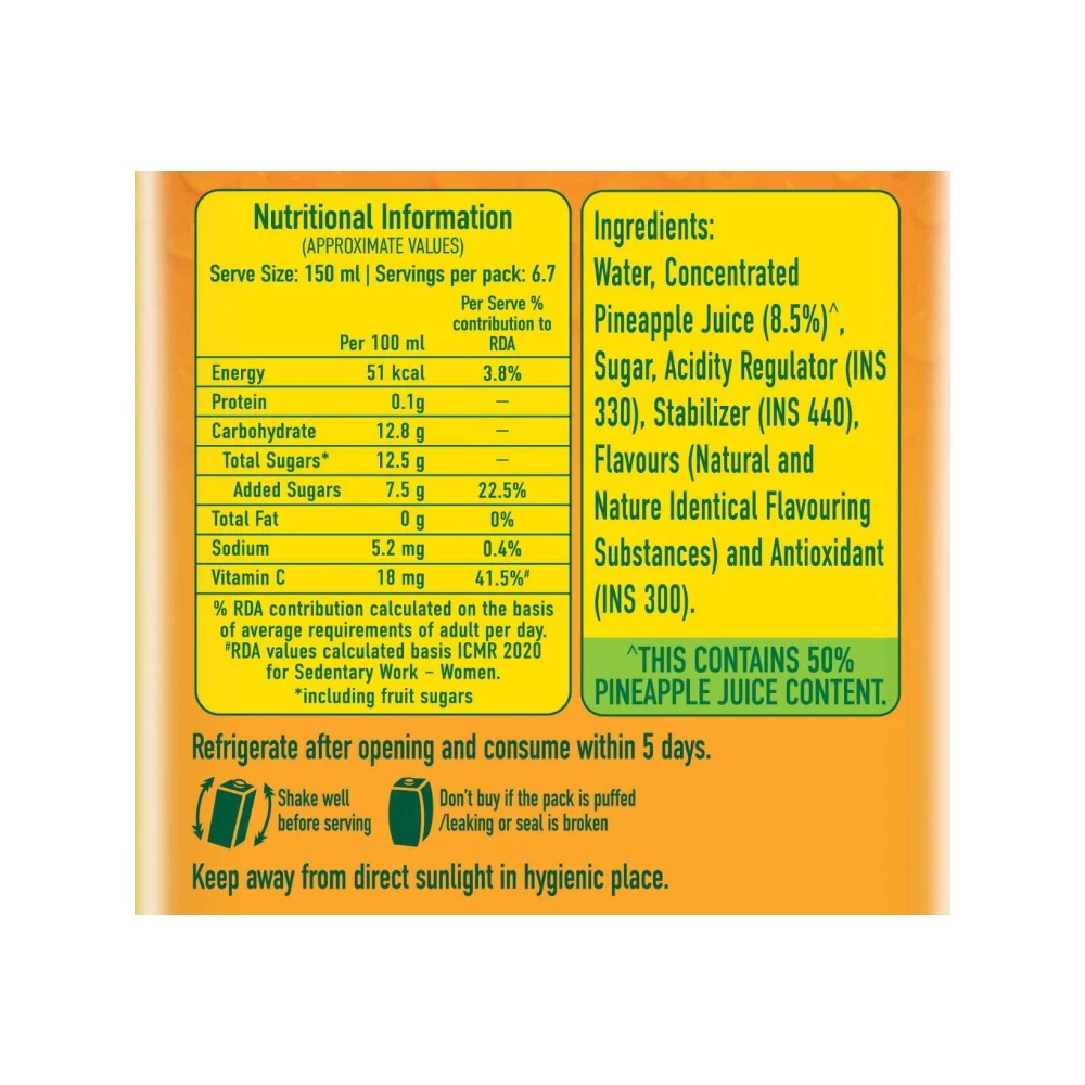 Ingredients: Water, Pineapple, Juice Concentrate (12.8%) +, Sugar (6.5 g), Acidity Regulator (INS 330), Antioxidant (INS 300)