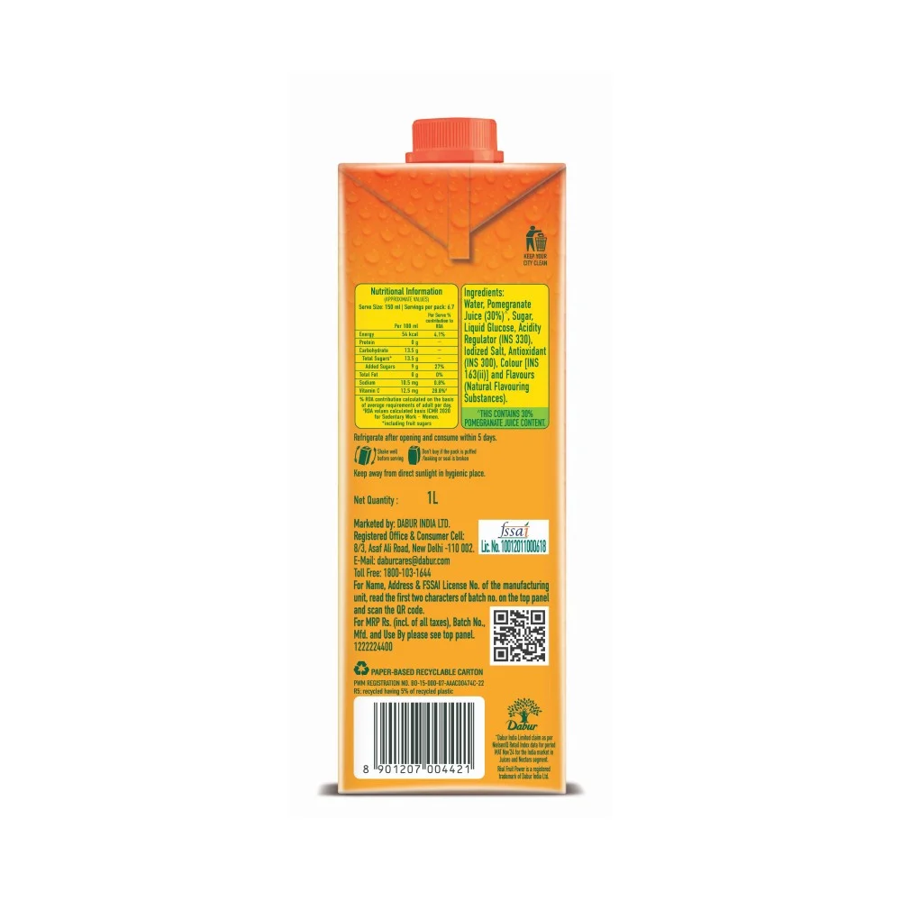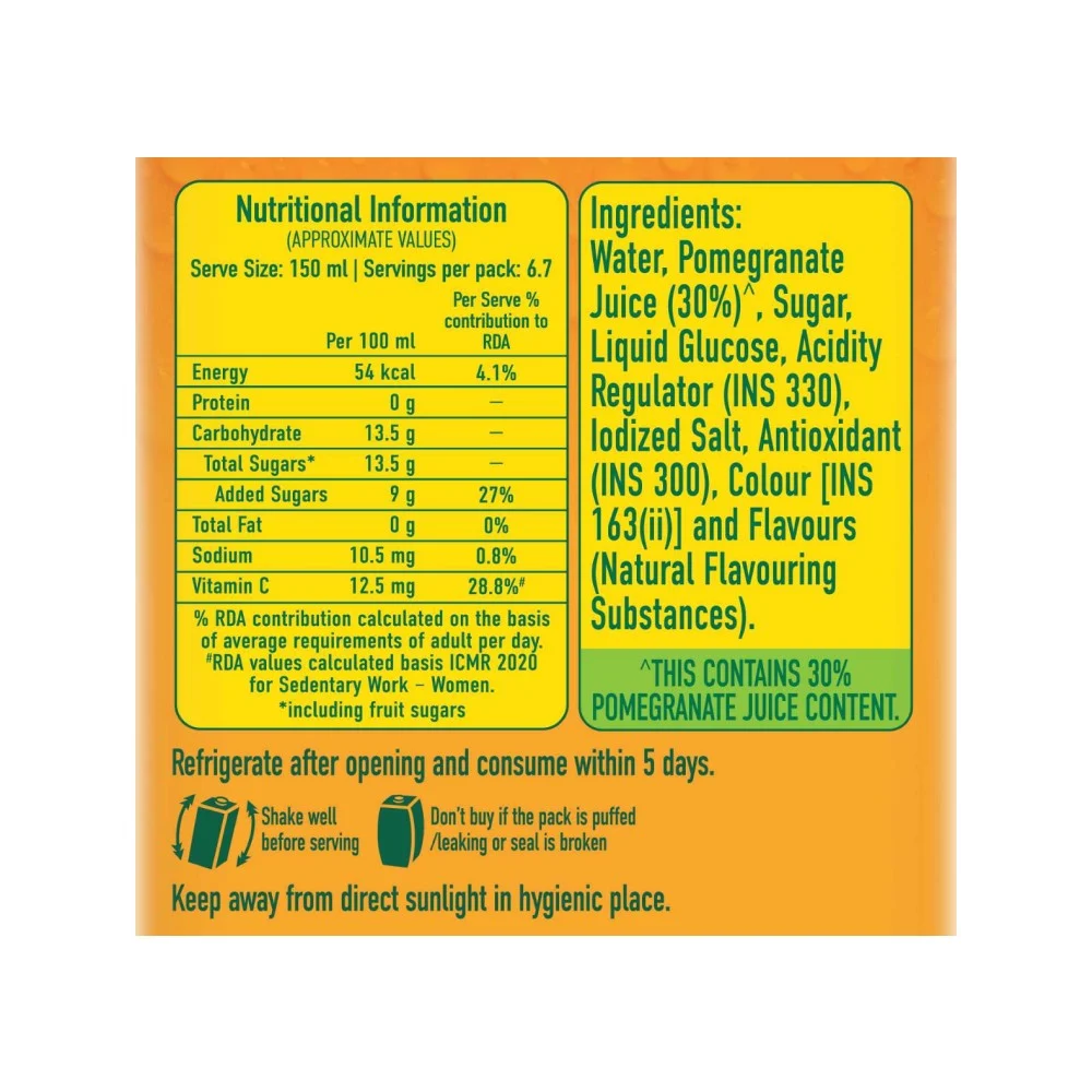 Ingredients: Water, Pomegranate Juice(35.1%)*, Sugar, Liquid Glucose Aronia Salt, Acidity regulator (INS 300), Antioxidants (INS 300) Contains added nature identical pomegranate flavour. No added colour or preservatives.